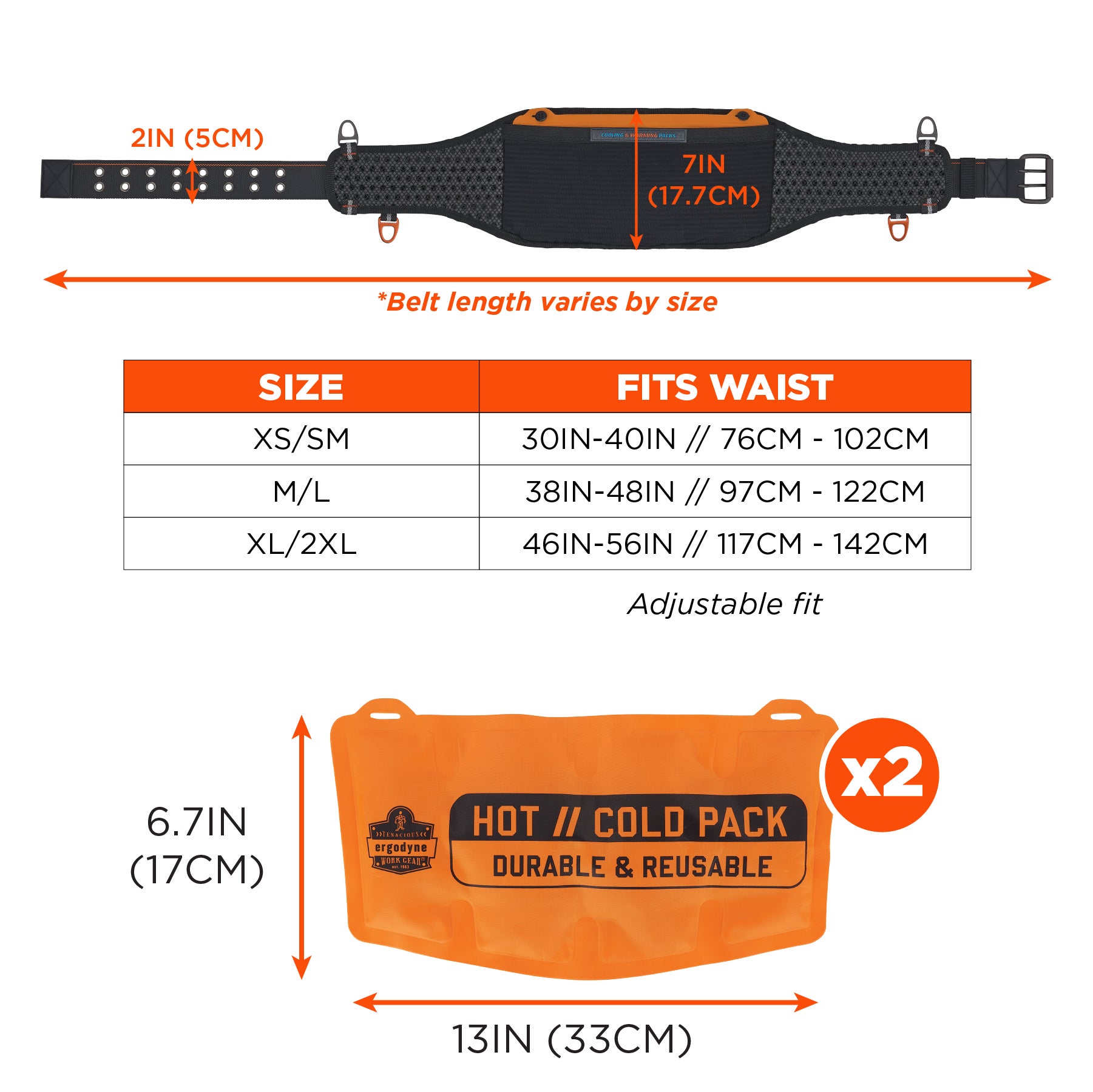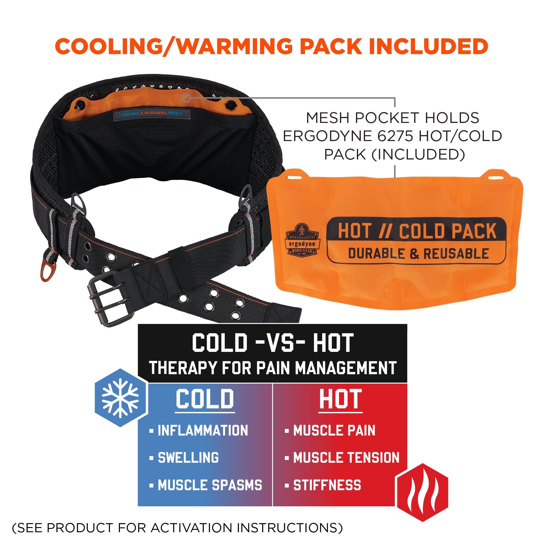 Each tool belt includes a rear mesh pocket for ProFlex 6275 Reusable Hot/Cold Pack (included) to help manage body temperature during use. The pack can be cooled in a refrigerator or freezer for warm conditions, or heated in a microwave or on a stovetop for cold environments. To install, slide the pack into the rear mesh pocket and secure it in place using the two button tabs.
