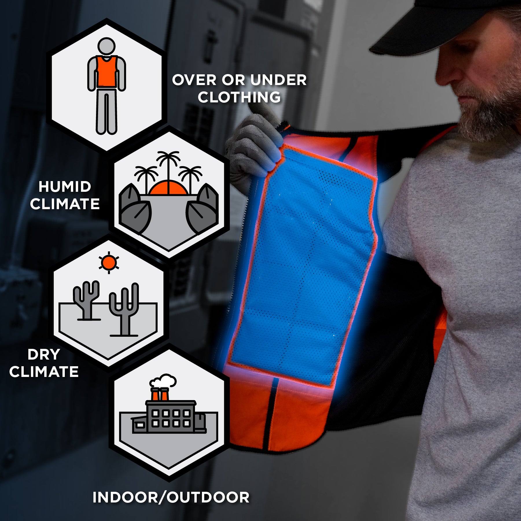 Ideal for anyone needing instant cooling relief while working or being active in warm environments, indoors or outdoors. Great for industrial settings like pulp/paper, iron/steel and foundries, as well as running, biking, yard work and more. A strong solution for those who can’t use evaporative cooling options.