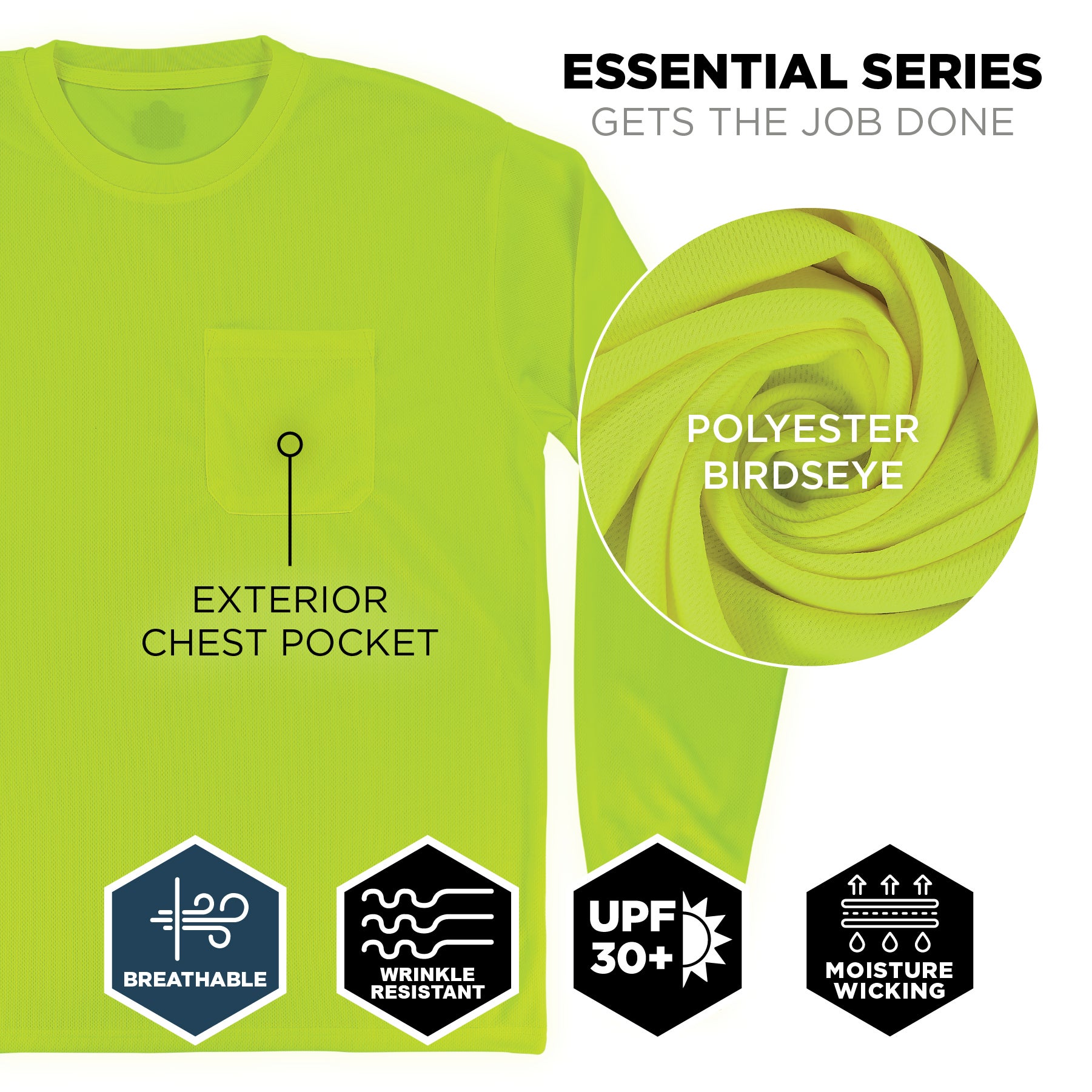 The GloWear 8093 Non-Certified Essential Hi-Vis Long Sleeve T-Shirt is designed to enhance visibility in low-light conditions with hi-vis fabric. The fabric is made from a polyester birdseye knit (4.6oz), offering a perfect balance of durability and softness, allowing for all-day comfort without sacrificing practicality.