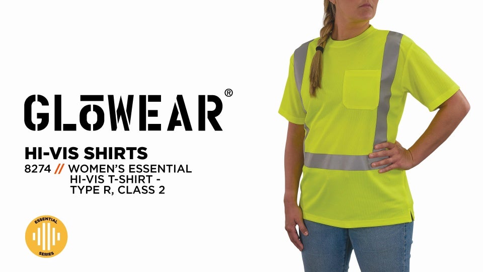 The GloWear 8274 Women’s Essential Hi-Vis T-Shirt is designed to enhance visibility in low-light and nighttime conditions with ANSI/ISEA 107-2020, Type R, Class 2 compliant hi-vis fabric and 2” reflective, solid tape.