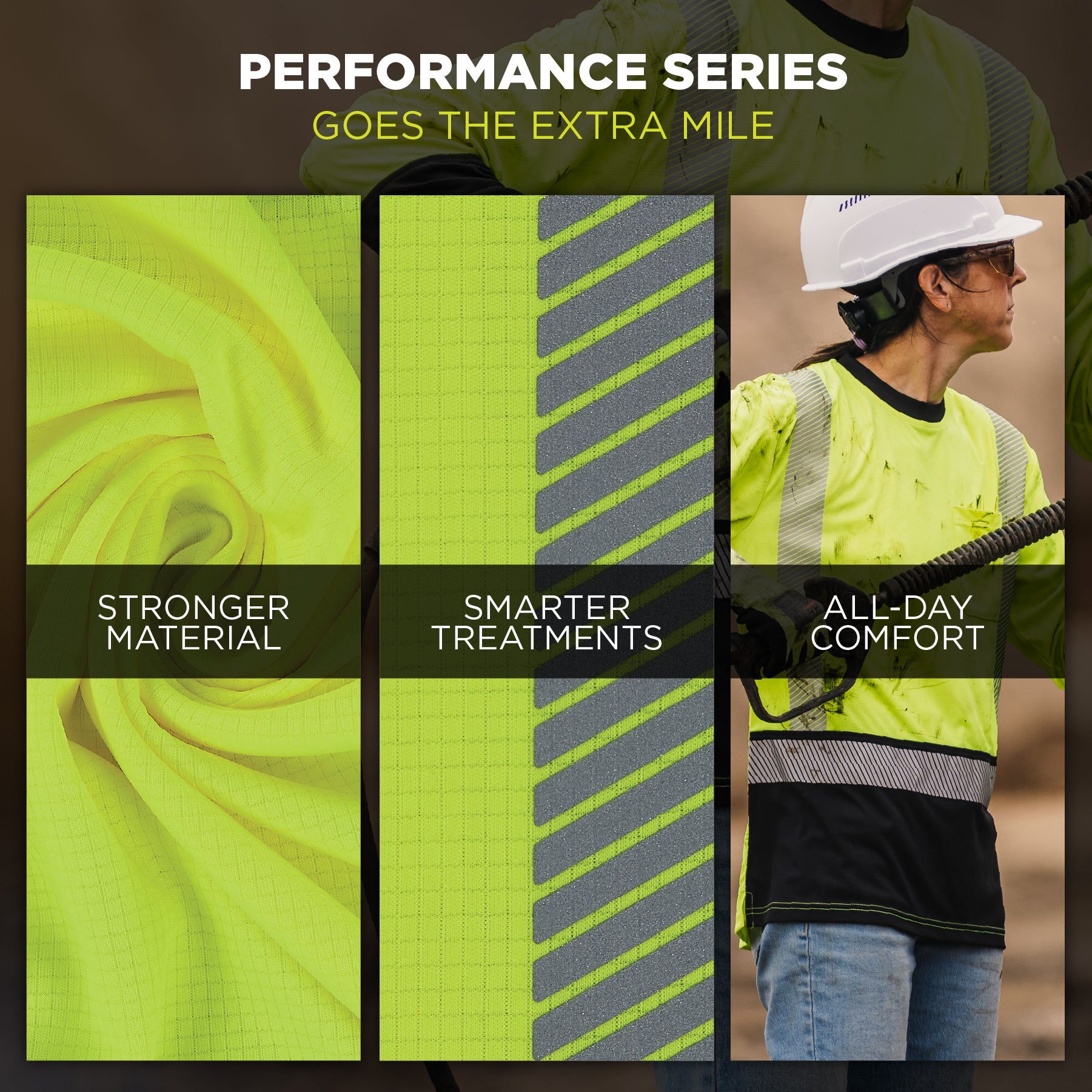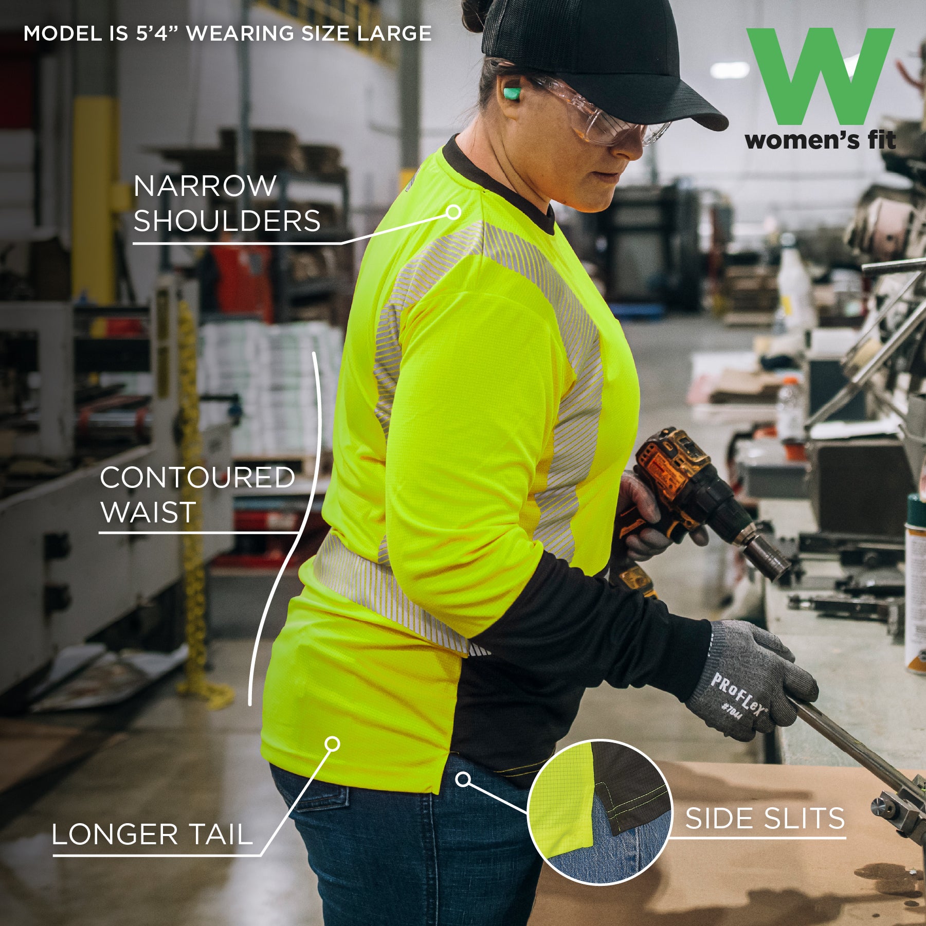 The GloWear 8278BK Women’s Performance Hi-Vis Long Sleeve T-Shirt is designed with a focus on both safety and comfort, offering a range of features that ensure optimal performance throughout the workday. ANSI/ISEA 107-2020, Type R, Class 2 compliant fabric has 2” reflective, segmented tape to ensure visibility in low-light and nighttime situations.