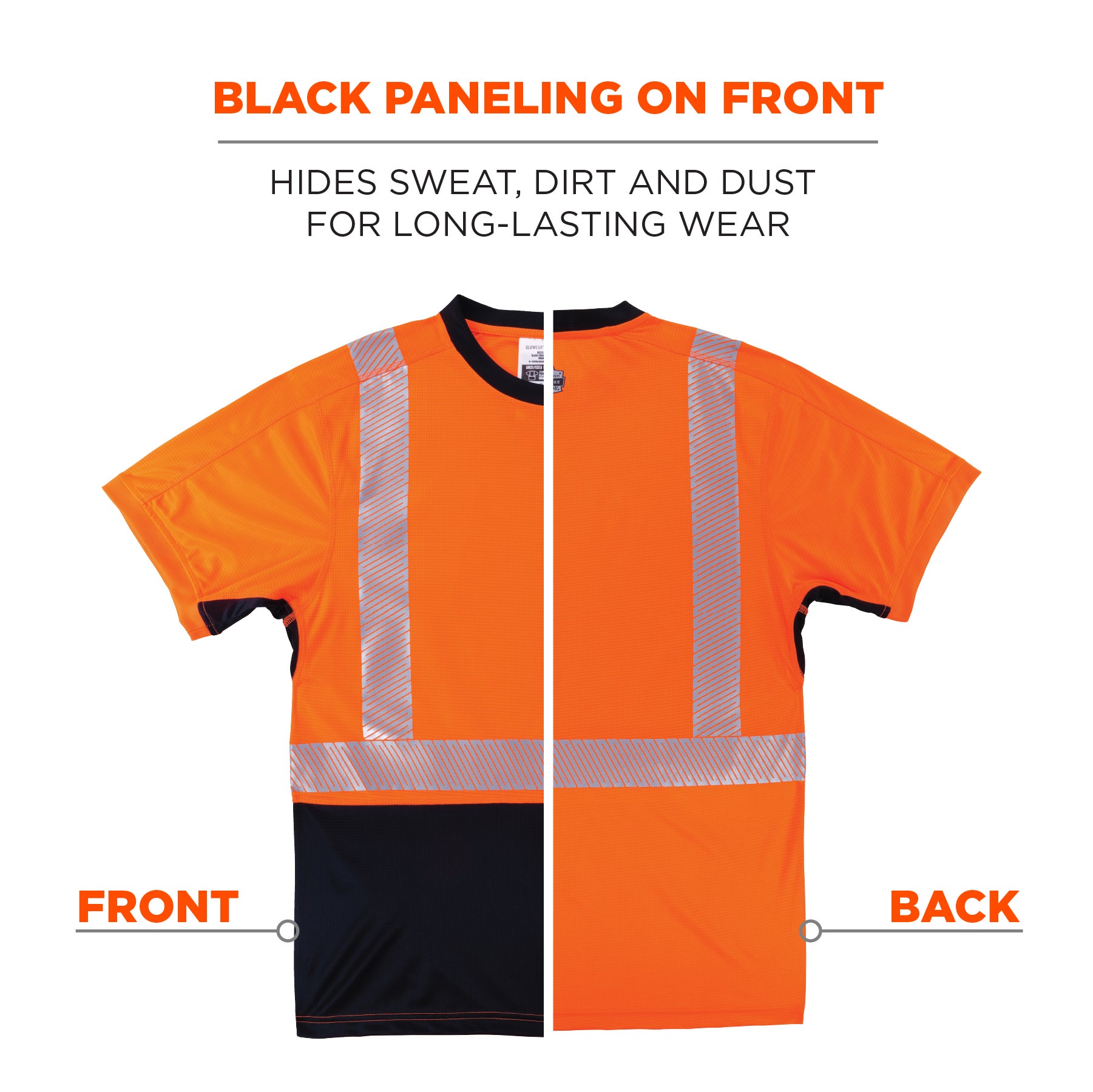 The black panel across the bottom hides dirt, grit and dust to keep the shirt looking cleaner longer. Additionally, black vented underarm panels hide sweat and improve breathability. This hi-vis work shirt uses segmented 2” reflective tape for enhanced visibility at night or in low-light conditions. Unlike solid reflective tape, the flexibility of segmented tape allows reflective clothing to feel more comfortable, lightweight and breathable.