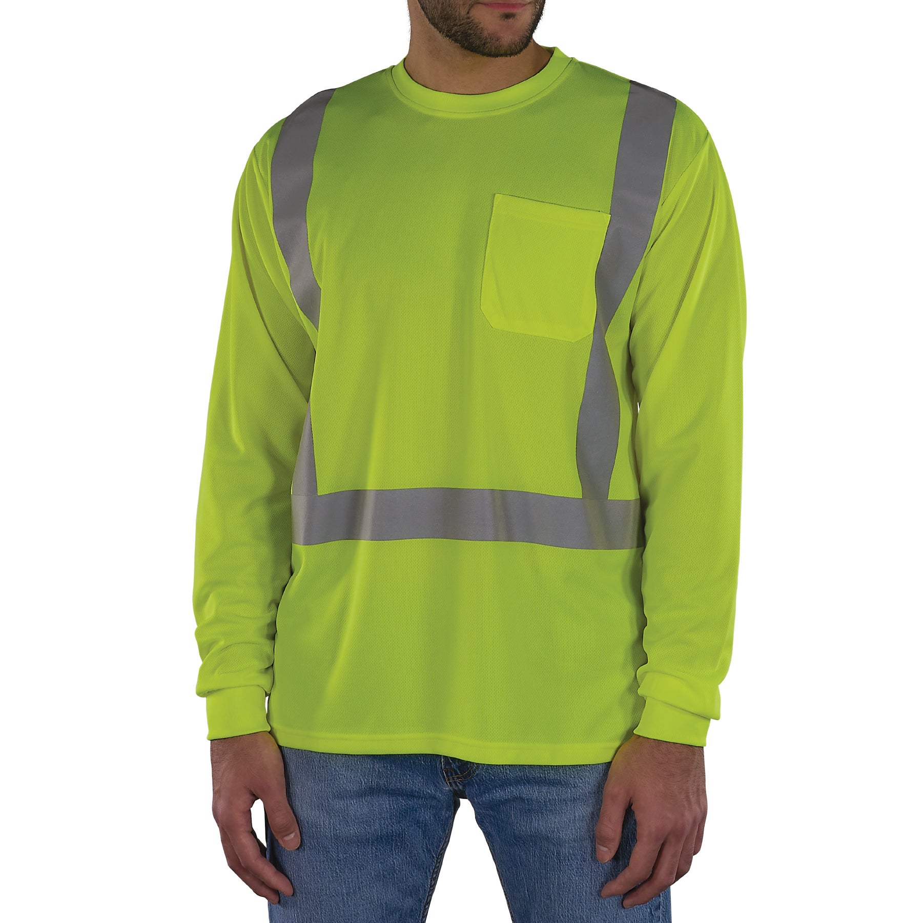 The GloWear 8284 Essential Hi-Vis Long Sleeve T-Shirt is designed to enhance visibility in low-light and nighttime conditions with ANSI/ISEA 107-2020, Type R, Class 2 compliant hi-vis fabric and 2” reflective, solid tape.