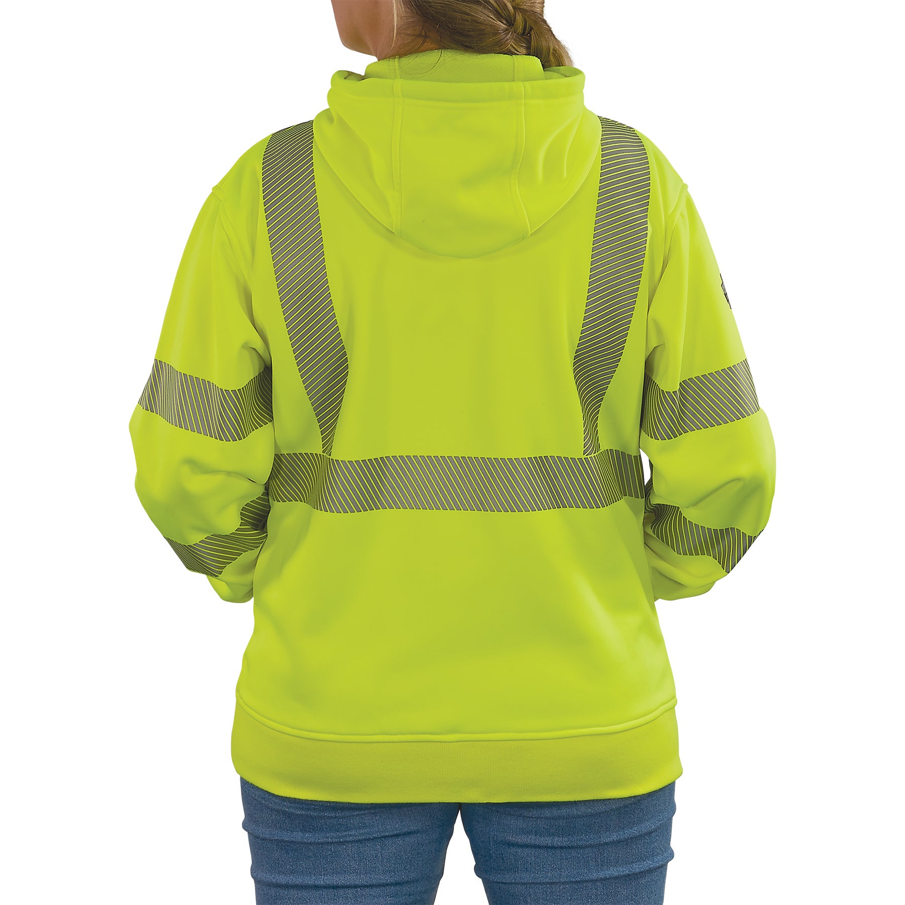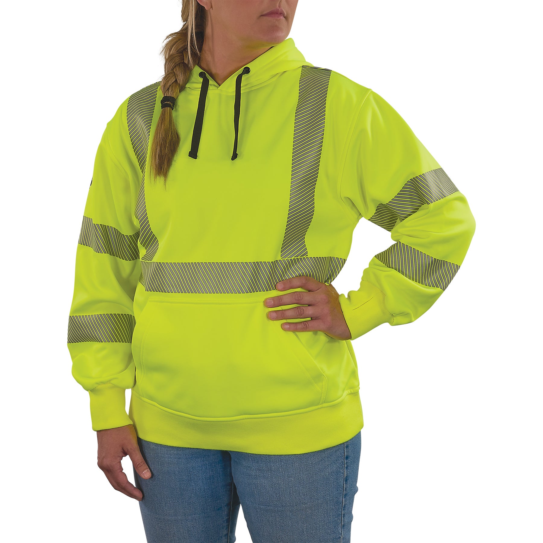 The GloWear 8304W Women’s Performance Hi-Vis Hooded Sweatshirt is designed with a focus on both safety and comfort, offering a range of features that ensure optimal performance throughout the workday. ANSI/ISEA 107-2020, Type R, Class 3 compliant fabric has 2” reflective, segmented tape to ensure visibility in low-light and nighttime situations.