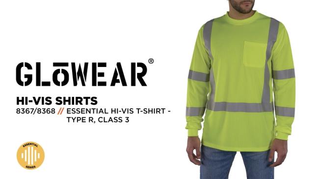 The GloWear 8367 Essential Hi-Vis T-Shirt is designed to enhance visibility in low-light and nighttime conditions with ANSI/ISEA 107-1010, Type R, Class 3 compliant hi-vis fabric and 2” reflective, solid tape.
