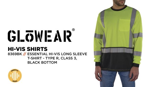 The GloWear 8369BK Essential Hi-Vis Long Sleeve T-Shirt is designed to enhance visibility in low-light and nighttime conditions with ANSI/ISEA 107-2020, Type R, Class 3 compliant hi-vis fabric and 2” reflective, solid tape.