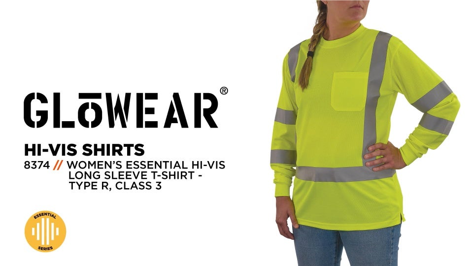The GloWear 8374 Women’s Essential Hi-Vis Long Sleeve T-Shirt designed to enhance visibility in low-light and nighttime conditions with ANSI/ISEA 107-2020, Type R, Class 3 compliant hi-vis fabric and 2” reflective, solid tape.
