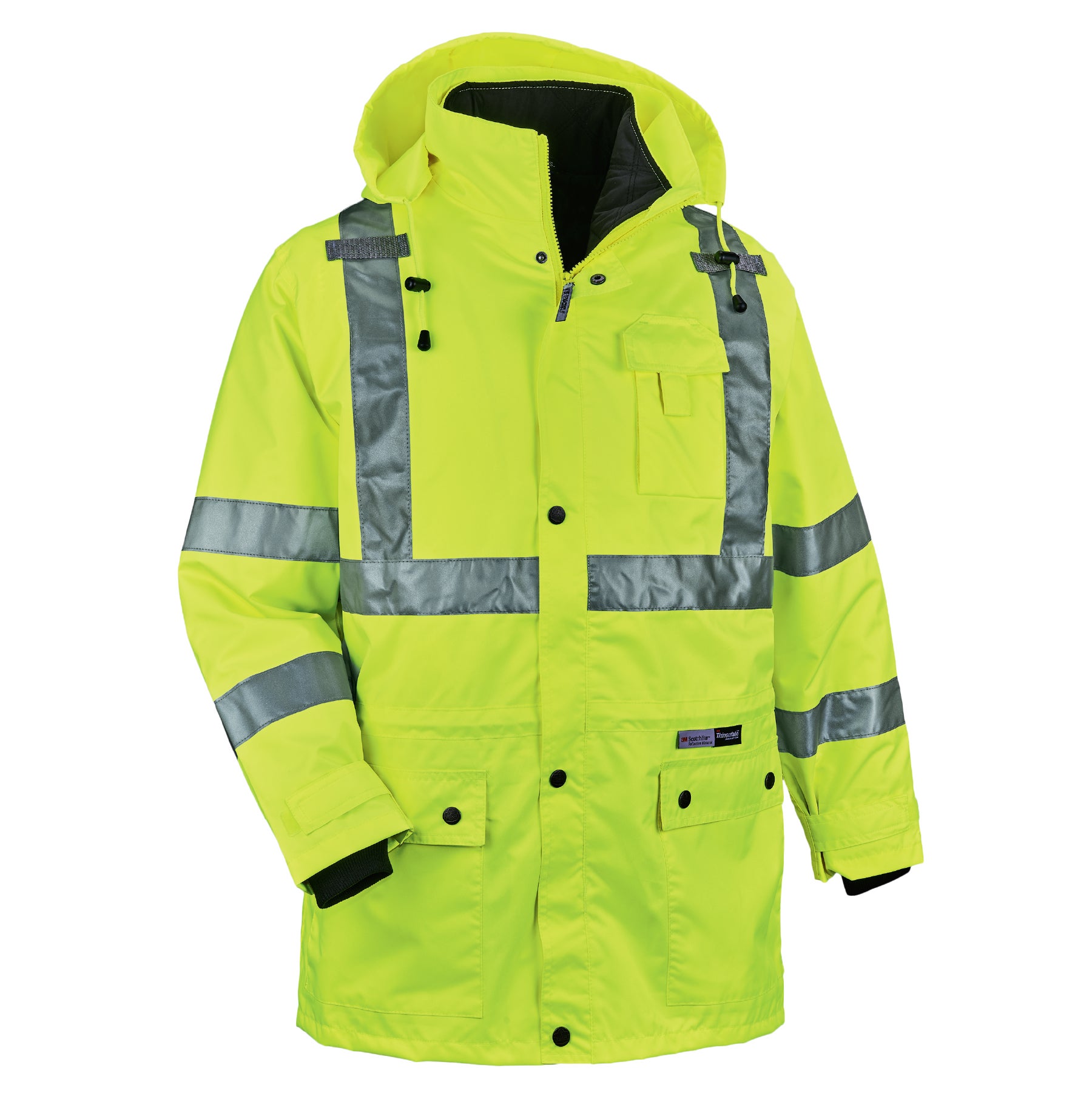 The GloWear 8385 4-in-1 Hi-Vis Winter Jacket Parka features a 100g 3M Thinsulate liner jacket and a waterproof 300D polyester shell to resist wind, while remaining breathable for warmth and dry comfort on the job. Adjustable hook & loop cuffs seal out cold and allow for comfortable wear with gloves, while a zippered closure makes for easy on and off. The inset hood can be stowed away when not needed.