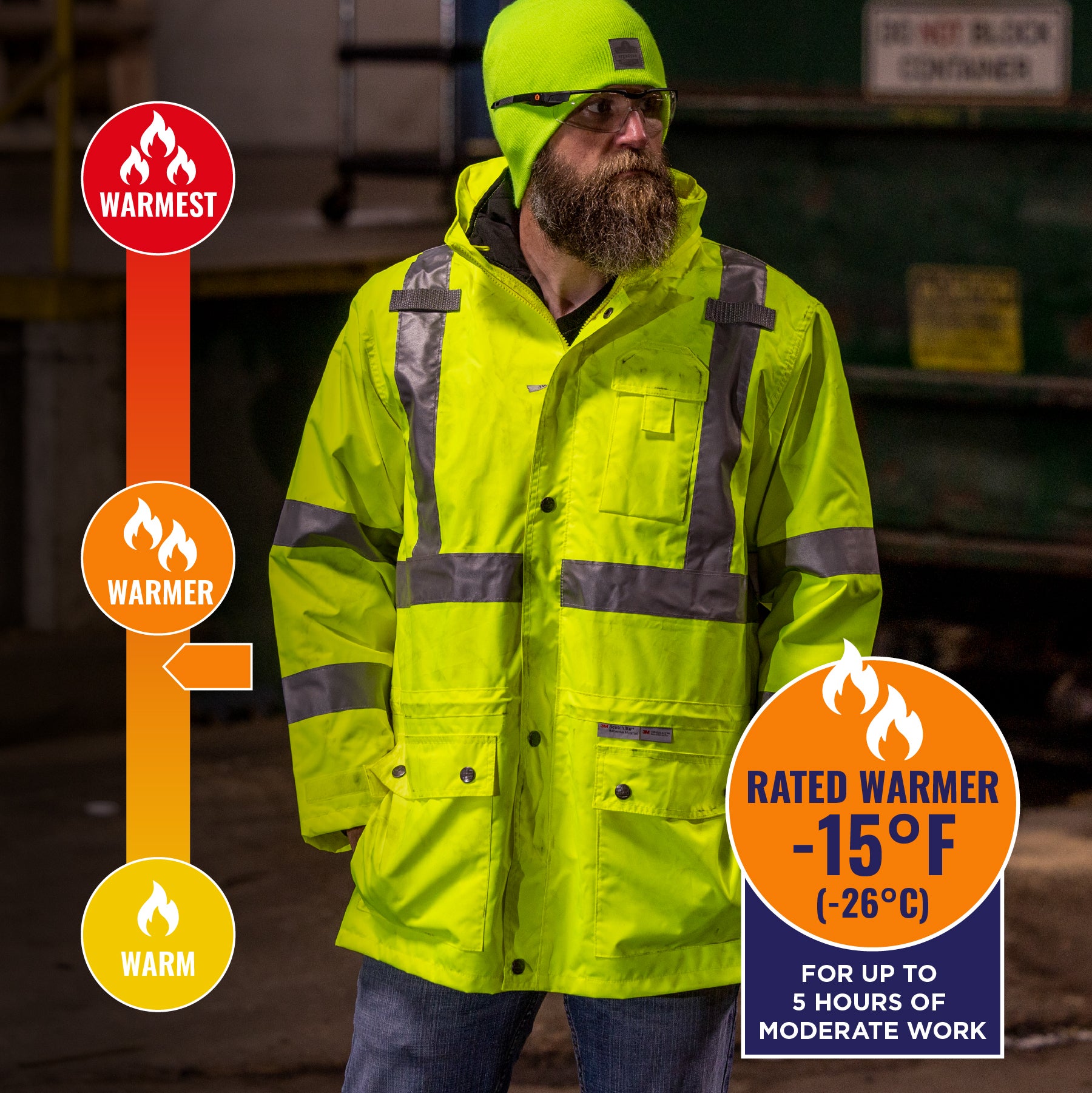 The outer hi-vis winter parka is a Type R Class 3 garment and features 2” reflective stripes that are ANSI/ISEA 107-2020-compliant for nighttime visibility. Type R Class 3 garments feature more fluorescent background material and retroreflective material than other classes, to ensure maximum visibility and safety in all conditions.