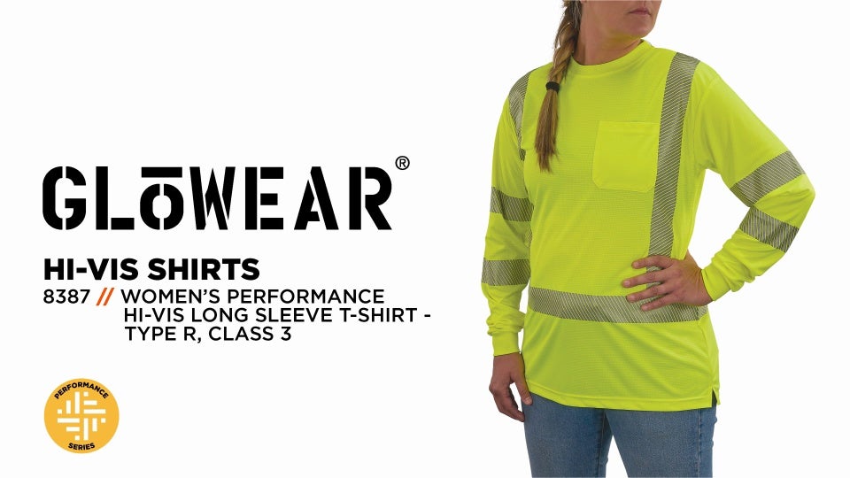The GloWear 8387 Women’s Performance Hi-Vis Long Sleeve T-Shirt is designed with a focus on both safety and comfort, offering a range of features that ensure optimal performance throughout the workday. ANSI/ISEA 107-2020, Type R, Class 3 compliant fabric has 2” reflective, segmented tape to ensure visibility in low-light and nighttime situations.