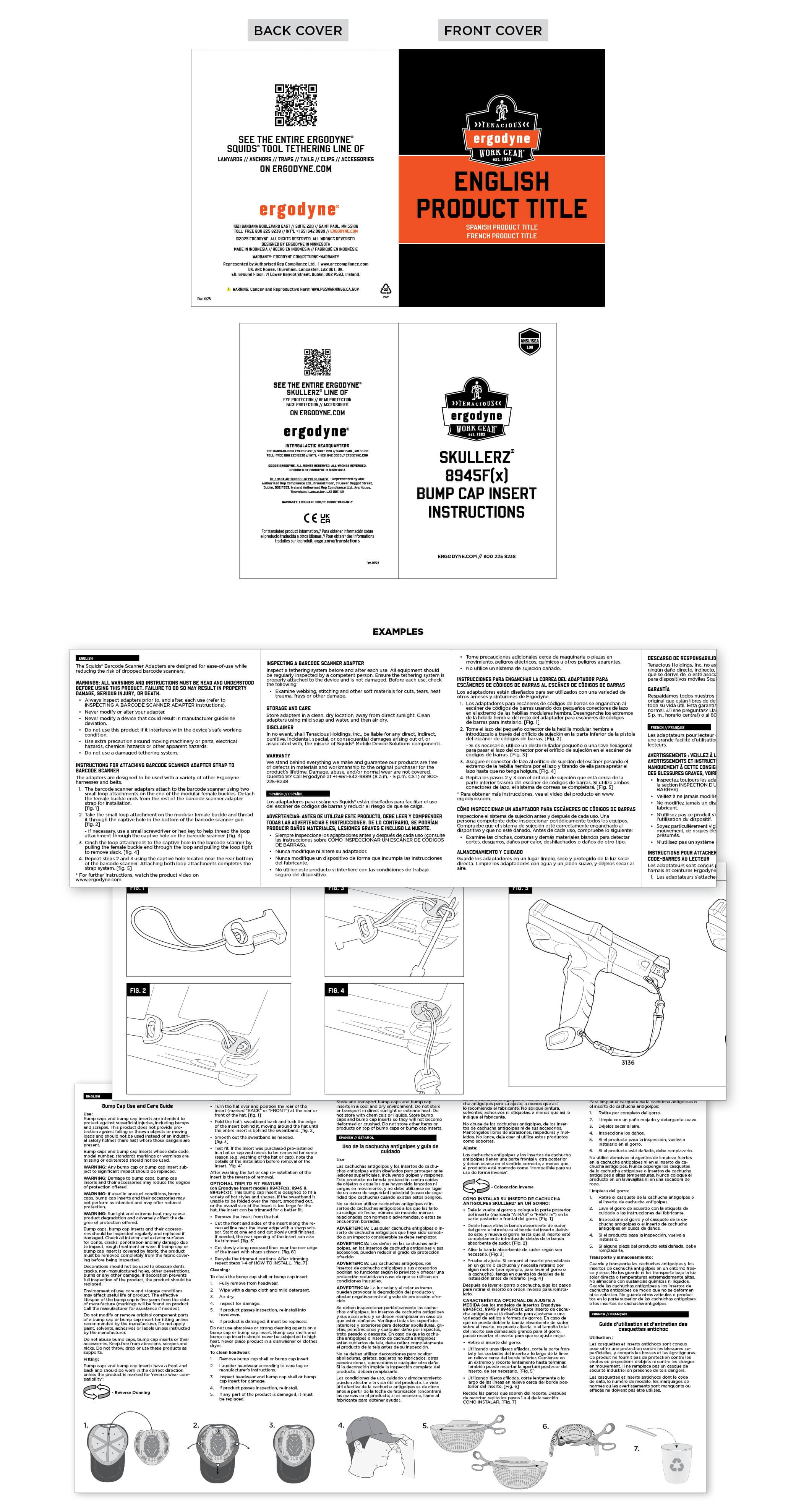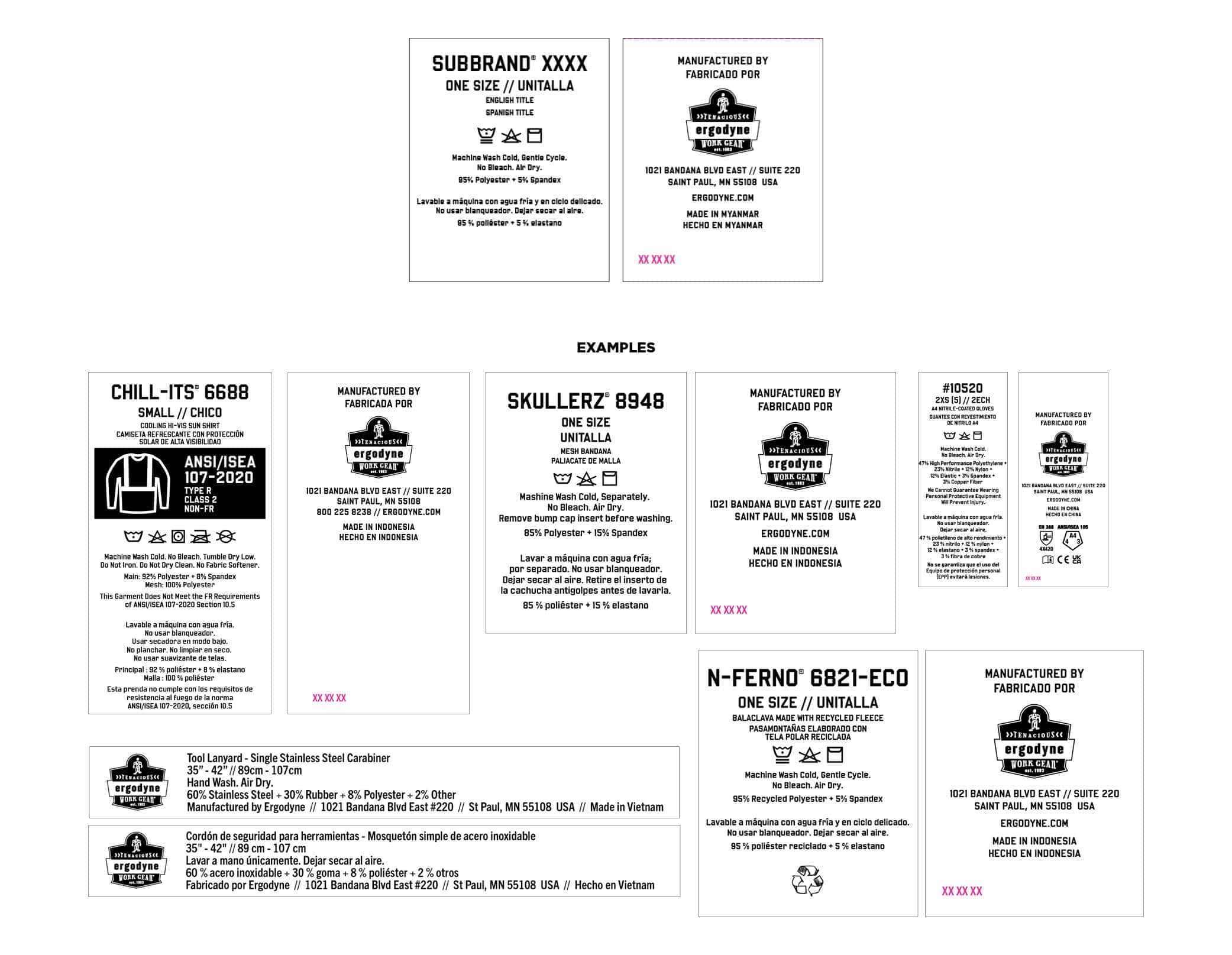 Interior labels generally include sub brand, product number, size, product titles, garment care icons and instructions, material content, Ergodyne logo, address, country of origin and a production code (XX XX XX in magenta, edited by factory during production). Some product categories (gloves, hi-vis, FR, etc.) may include additional regulatory information or test scores. Interior labels include Spanish translations.