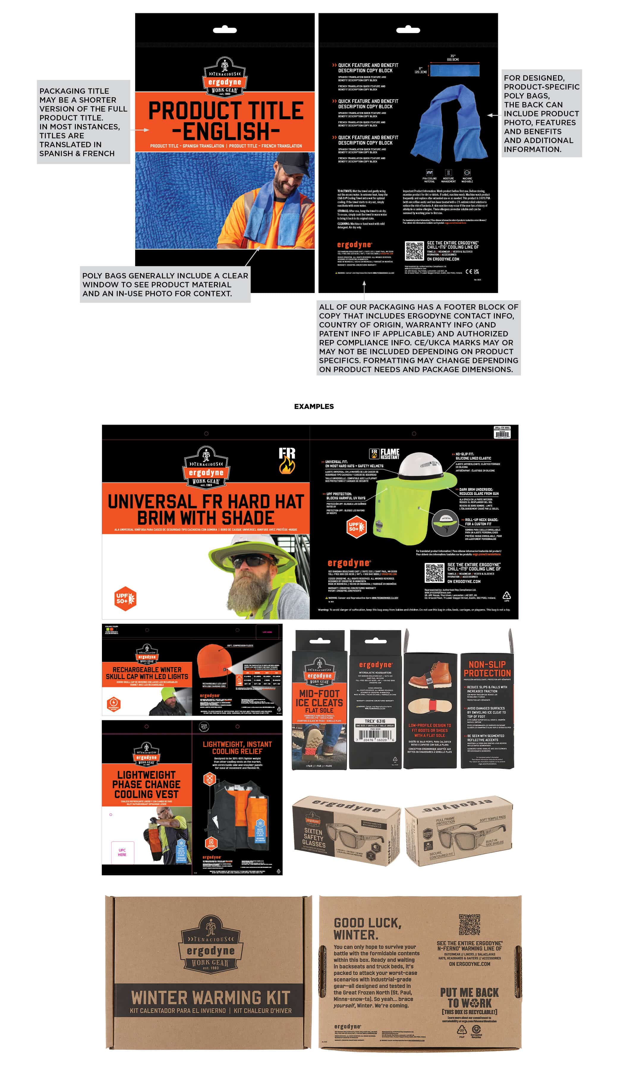 All of our packaging has a footer block of copy that includes Ergodyne contact info, country or origin, warranty info (and patent info if applicable) and authorized rep compliance info. CE/UKCA marks may or may not be included depending on product specifics. Formatting may change depending on product needs and packaging dimensions.