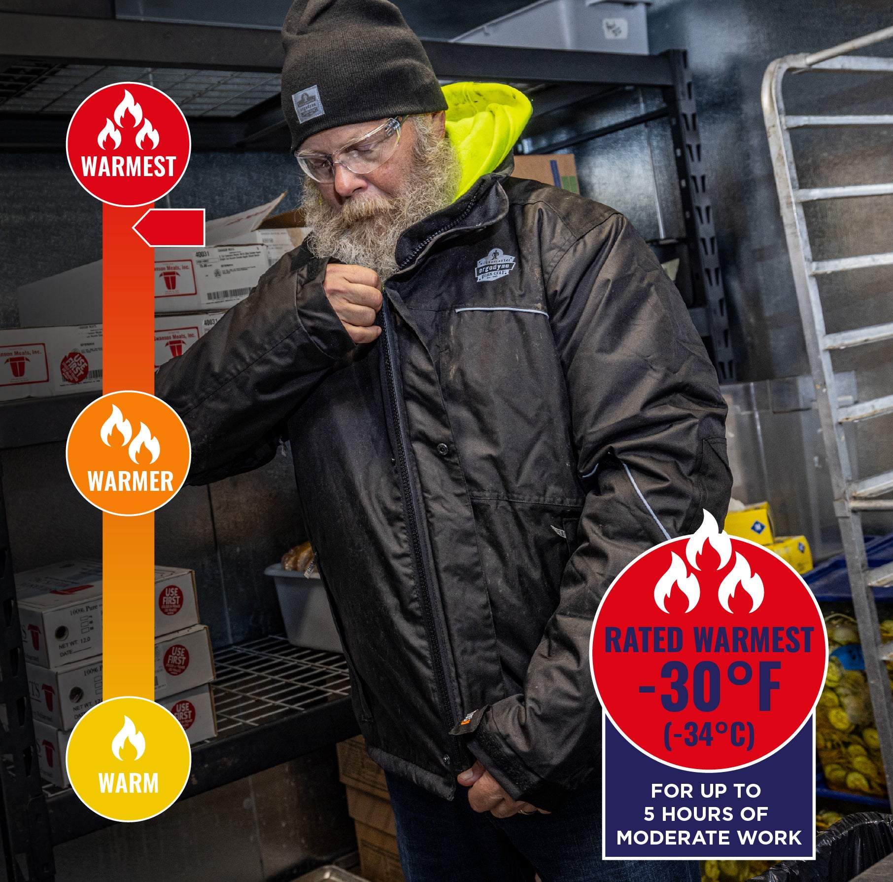 Some warehouses and facilities are more manual in nature, leading to higher MET levels, while others rely on automation, resulting in lower MET levels. N-Ferno 6467 Winter Work Jacket has a CLO rating of 2.05 and is rated at a moderate work level in -30°F // -34°C temperatures for up to 5 hours.