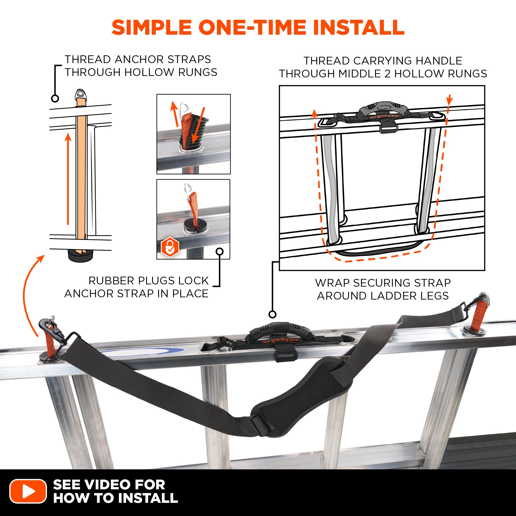 - FAST, SECURE SETUP - Installs to four ladder rungs using anchored straps, rubber plugs and a carrying handle or shoulder strap for balanced transport
