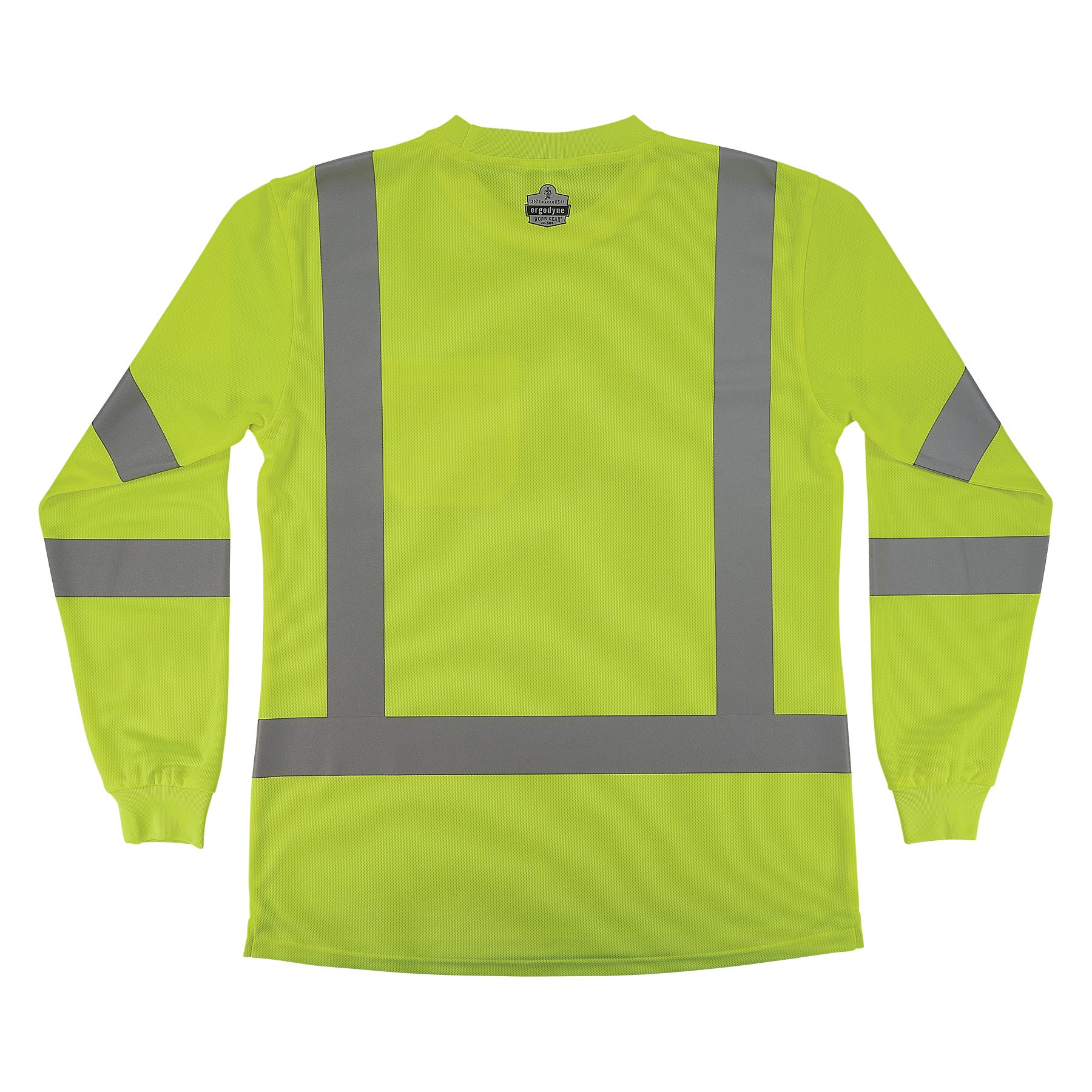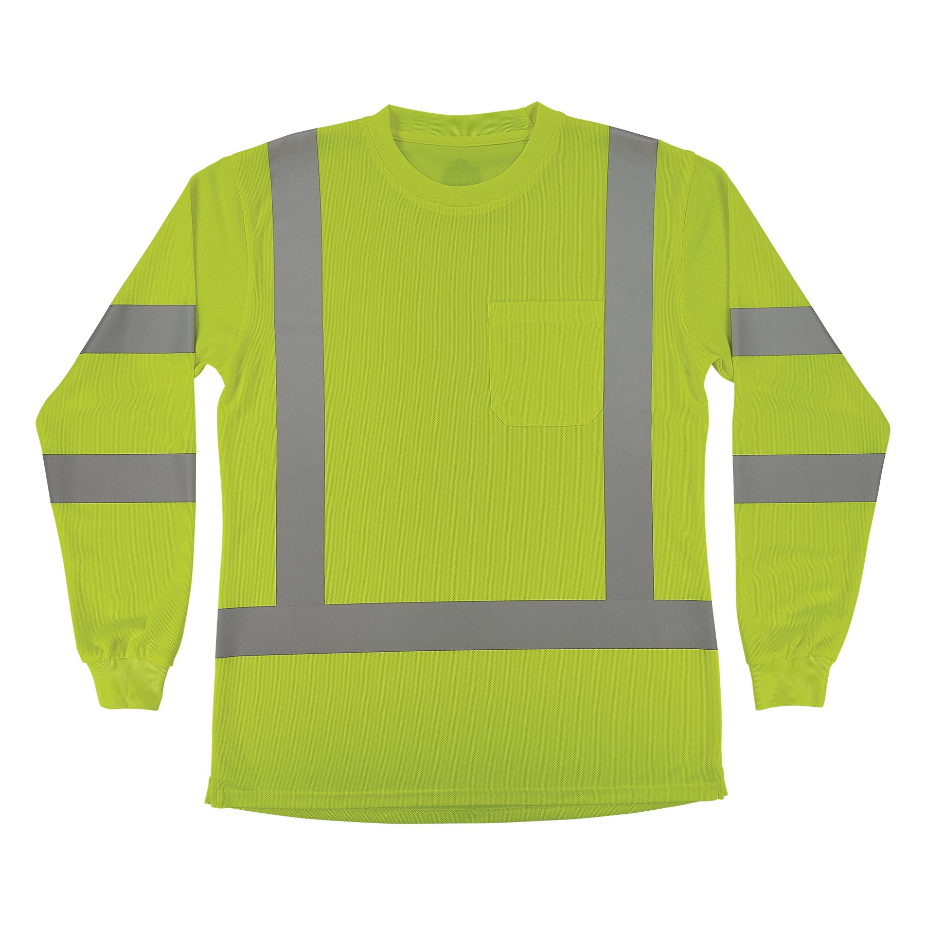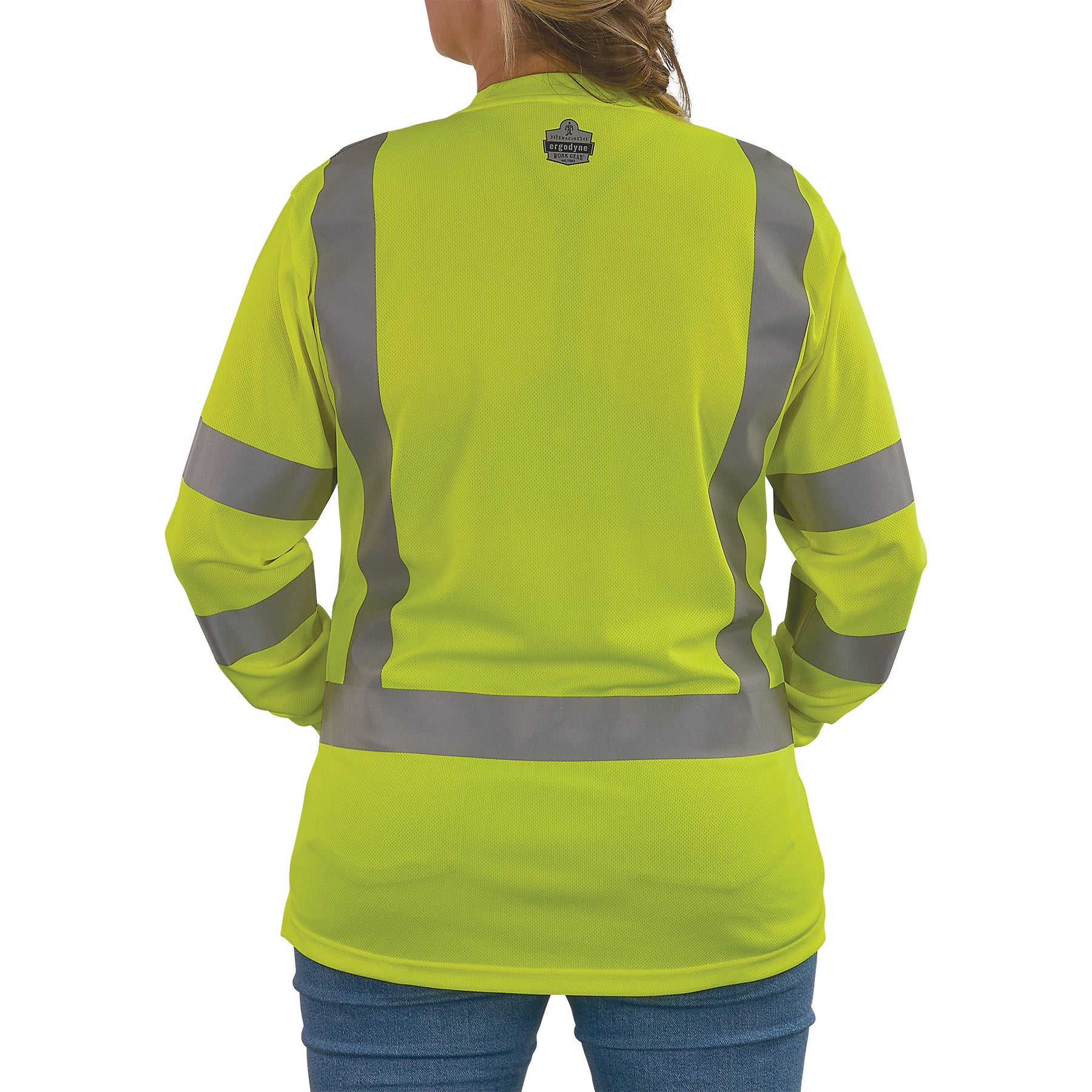 The GloWear 8374 Women’s Essential Hi-Vis Long Sleeve T-Shirt designed to enhance visibility in low-light and nighttime conditions with ANSI/ISEA 107-2020, Type R, Class 3 compliant hi-vis fabric and 2” reflective, solid tape.