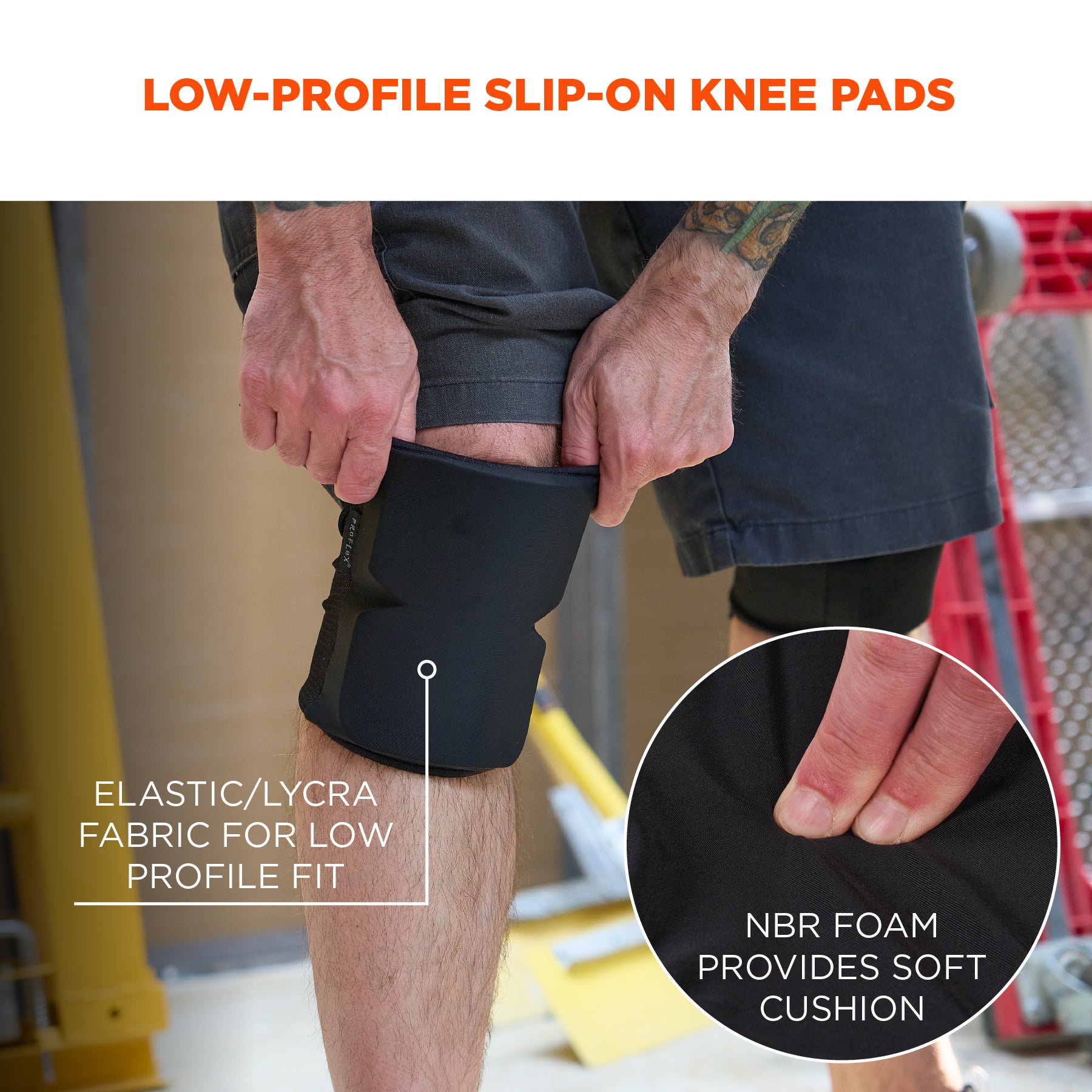 The ProFlex 260 Slip-On Knee Pads are designed for all-day comfort, featuring NBR foam that offers a soft cushion while maintaining its shape and support even with extended use, reducing strain on the knees during prolonged kneeling tasks. The soft strapless polyester fits comfortably under clothing, providing workers with an alternative to more traditional bulky knee pads.