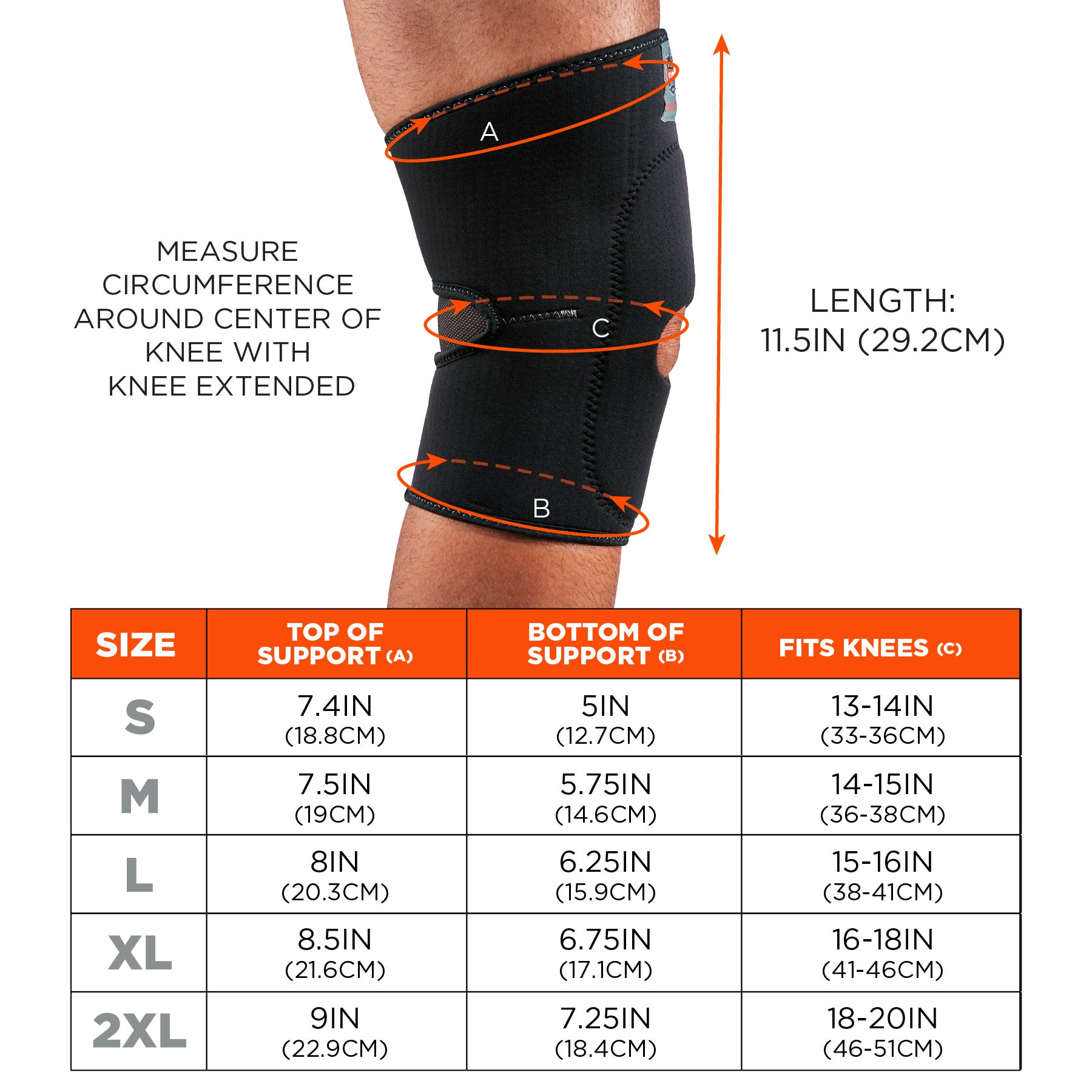 To determine size, measure the circumference around the center of your knee while the knee is extended.