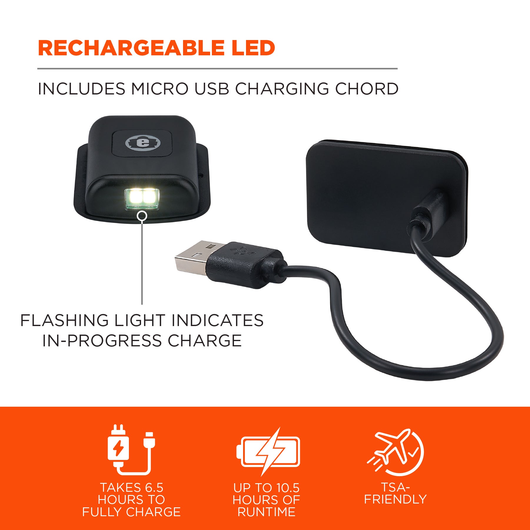 With up to 10.5 hours of runtime (on low) for each battery charge, you’ll always have visibility when you need it most. The light charges via a micro-USB charging cord (not included) and will return to full battery in up to 6.5 hours of charge time, with the light flashing while charging.