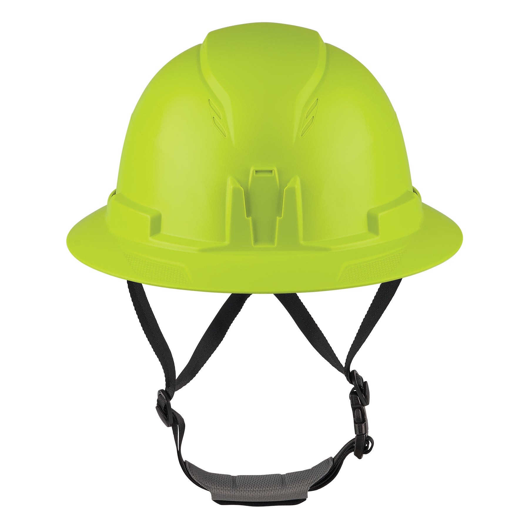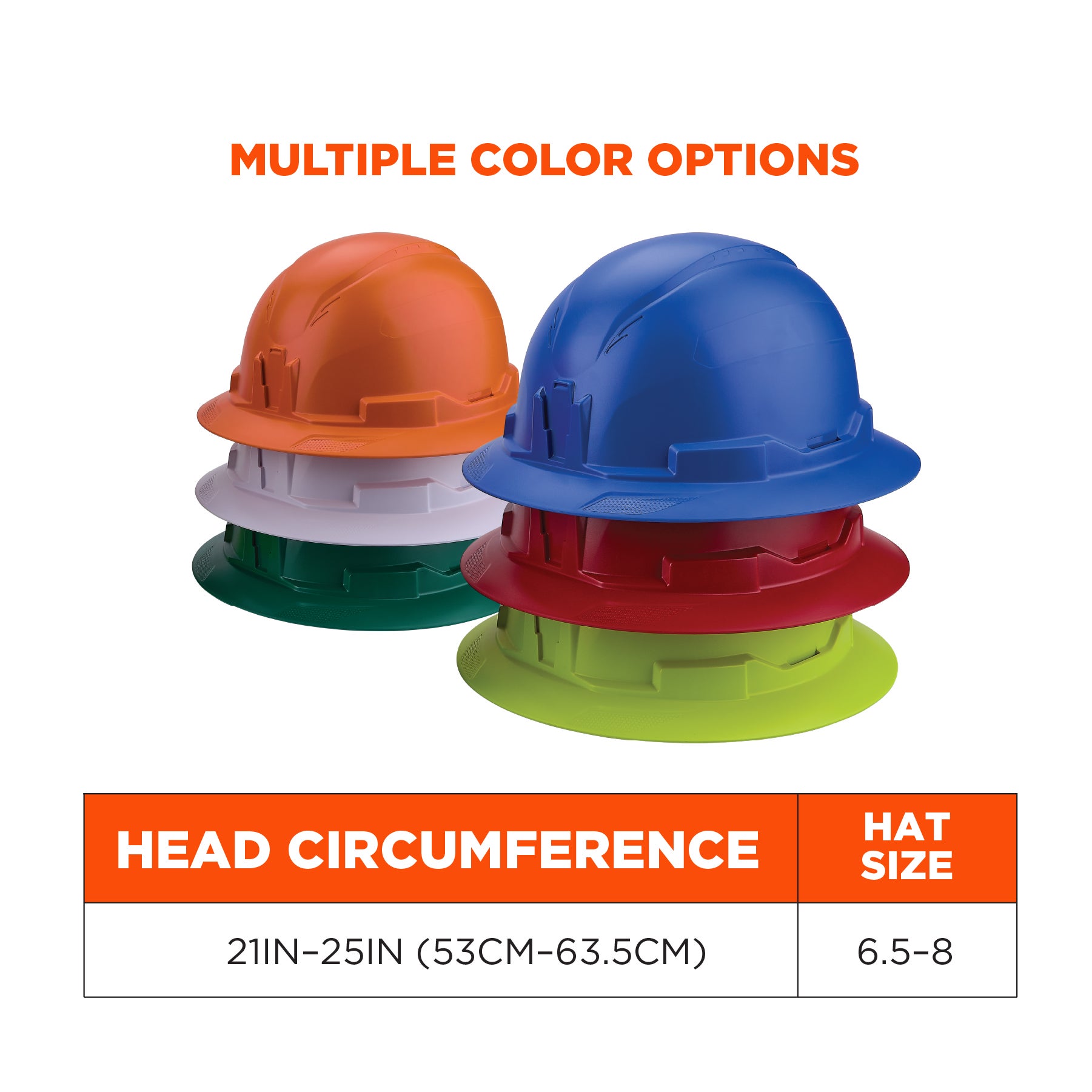 This safety hard hat fits hat sizes 6.5-8.25 (head circumference: 21in-26in // 53cm-66cm). The size of the height-adjustable 6-point suspension is easy to dial in using the one-handed LockFit™ ratchet system. Simply pull the rear knob out and twist to tighten or loosen the fit, and push knob in to securely lock in place. Built with weight distribution in mind, this safety helmet has a snug and balanced fit. An adjustable chin strap secures the helmet to the head and ensures it does not dislodge if the worker falls or is impacted by another object.