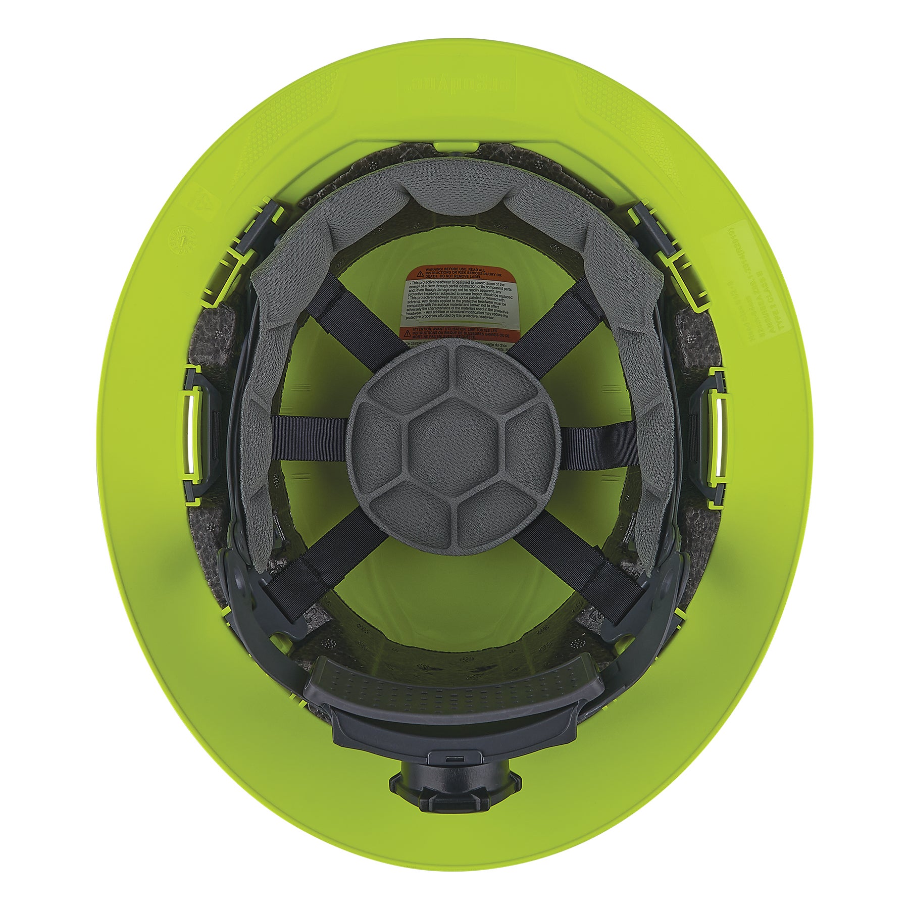 A padded, breathable and anti-microbial brushed polyester sweatband and top pad lines the sides, forehead and top interior, and is removable for easy replacement. The ventilated, open frame design makes for a cooler safety helmet by releasing heat buildup and allowing air to circulate—reducing perspiration in hot and humid working environments.