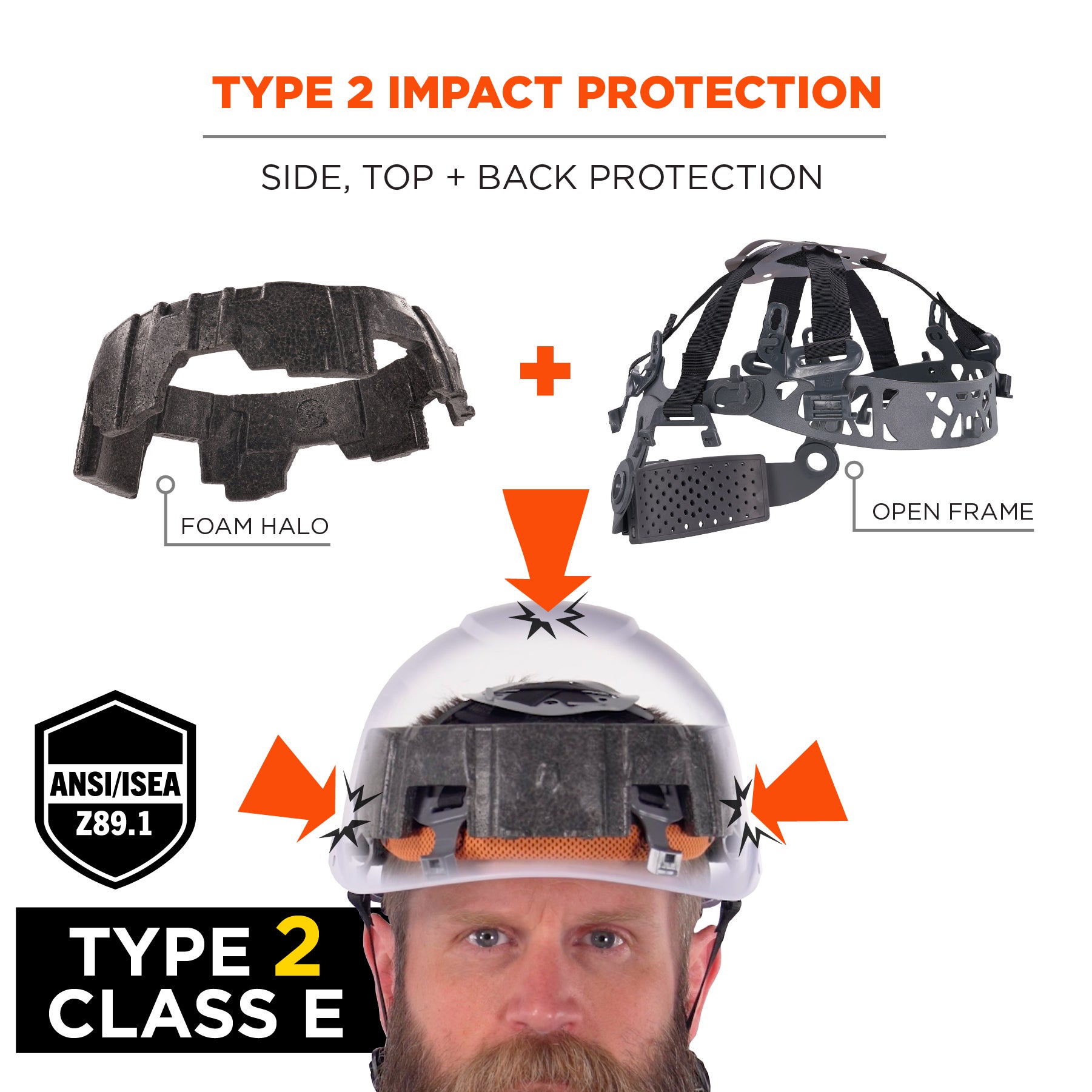 - ADDITIONAL IMPACT PROTECTION - Suspension and shell design fully compliant to ANSI/ISEA Z89.1-2014 (R2019) Type 2, Class E penetration and front, side and rear impact testing requirements for improved all-over protection