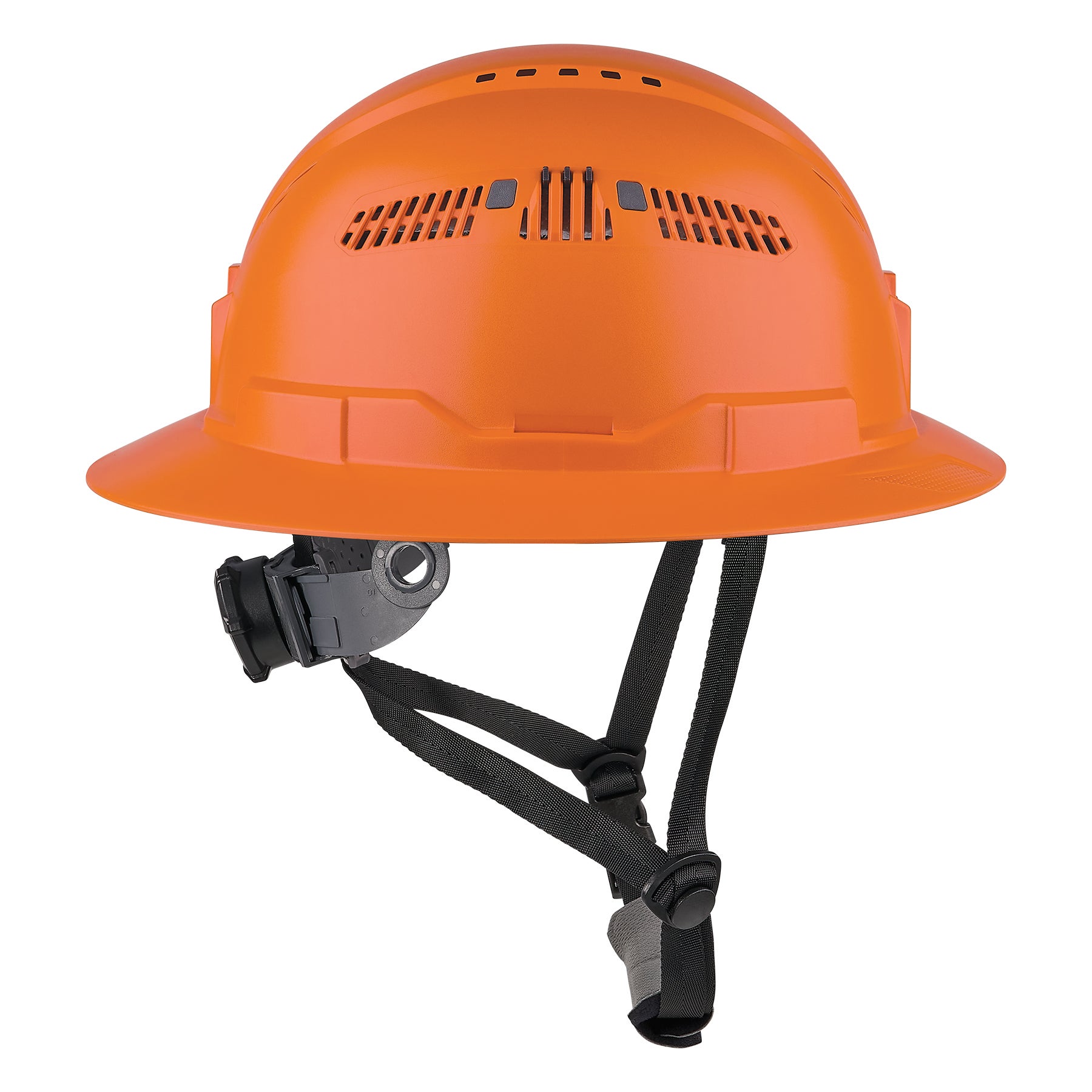 This safety hard hat fits hat sizes 6.5-8.25 (head circumference: 21in-26in // 53cm-66cm). The size of the height-adjustable 6-point suspension is easy to dial in using the one-handed LockFit™ ratchet system. Simply pull the rear knob out and twist to tighten or loosen the fit, and push knob in to securely lock in place. Built with weight distribution in mind, this safety helmet has a snug and balanced fit. An adjustable chin strap secures the helmet to the head and ensures it does not dislodge if the worker falls or is impacted by another object.