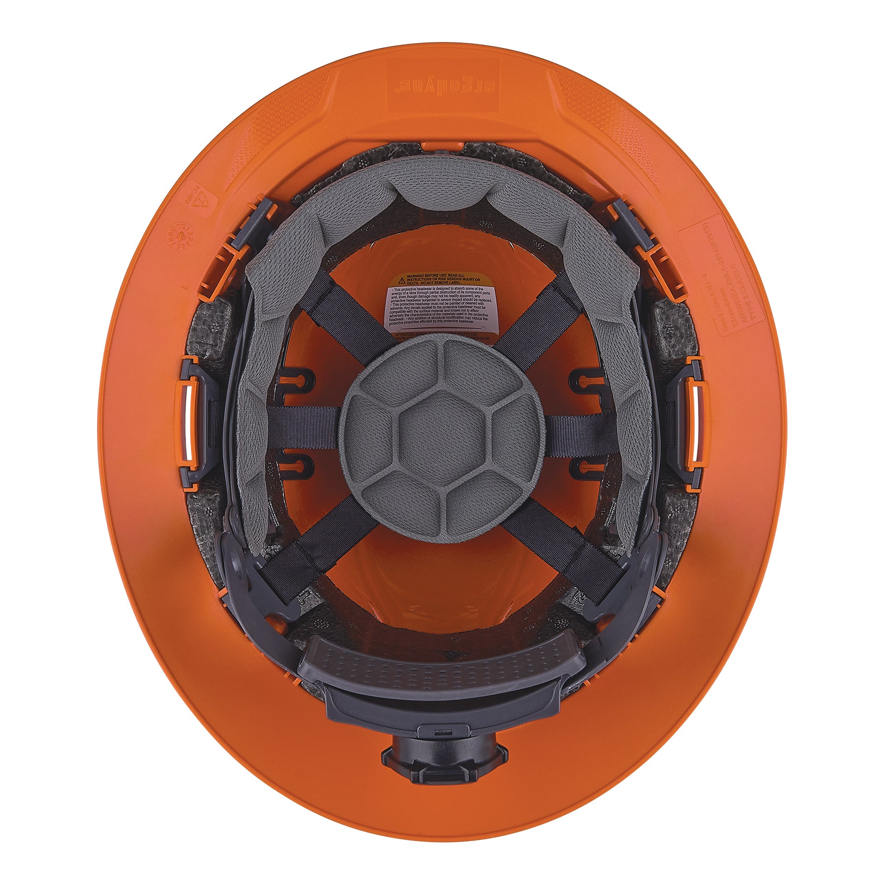 A padded, breathable and anti-microbial brushed polyester sweatband and top pad lines the sides, forehead and top interior, and is removable for easy replacement. The ventilated, open frame design makes for a cooler safety helmet by releasing heat buildup and allowing air to circulate—reducing perspiration in hot and humid working environments.
