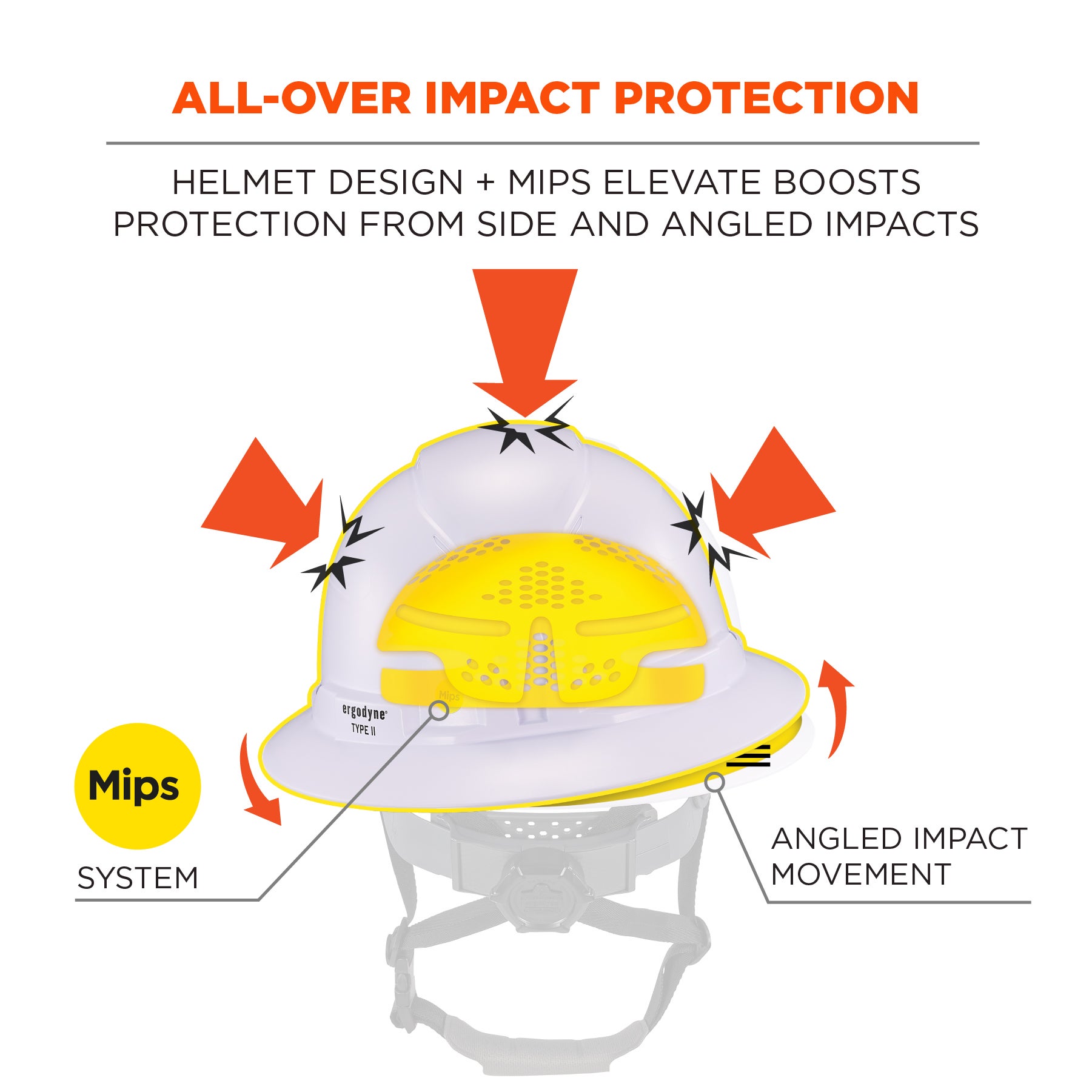 The Skullerz 8964-MIPS Type 2 Full Brim Safety Helmet is a Class C Safety Helmet with integrated Mips® technology designed to increase worker head protection by helping reduce the effect of dangerous angled impacts. The Mips Evolve Pro safety system is a low-friction layer that slides multi-directionally upon angled impact with the intention of reducing the transmission of rotational force to the head.