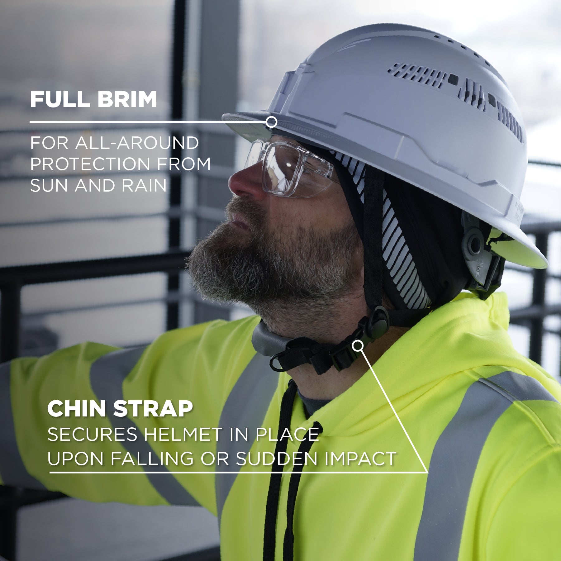 Ideal for those working at heights or needing a full brim helmet, as well as construction & utility job sites, oil & gas, road work, forestry, mining and general site work.