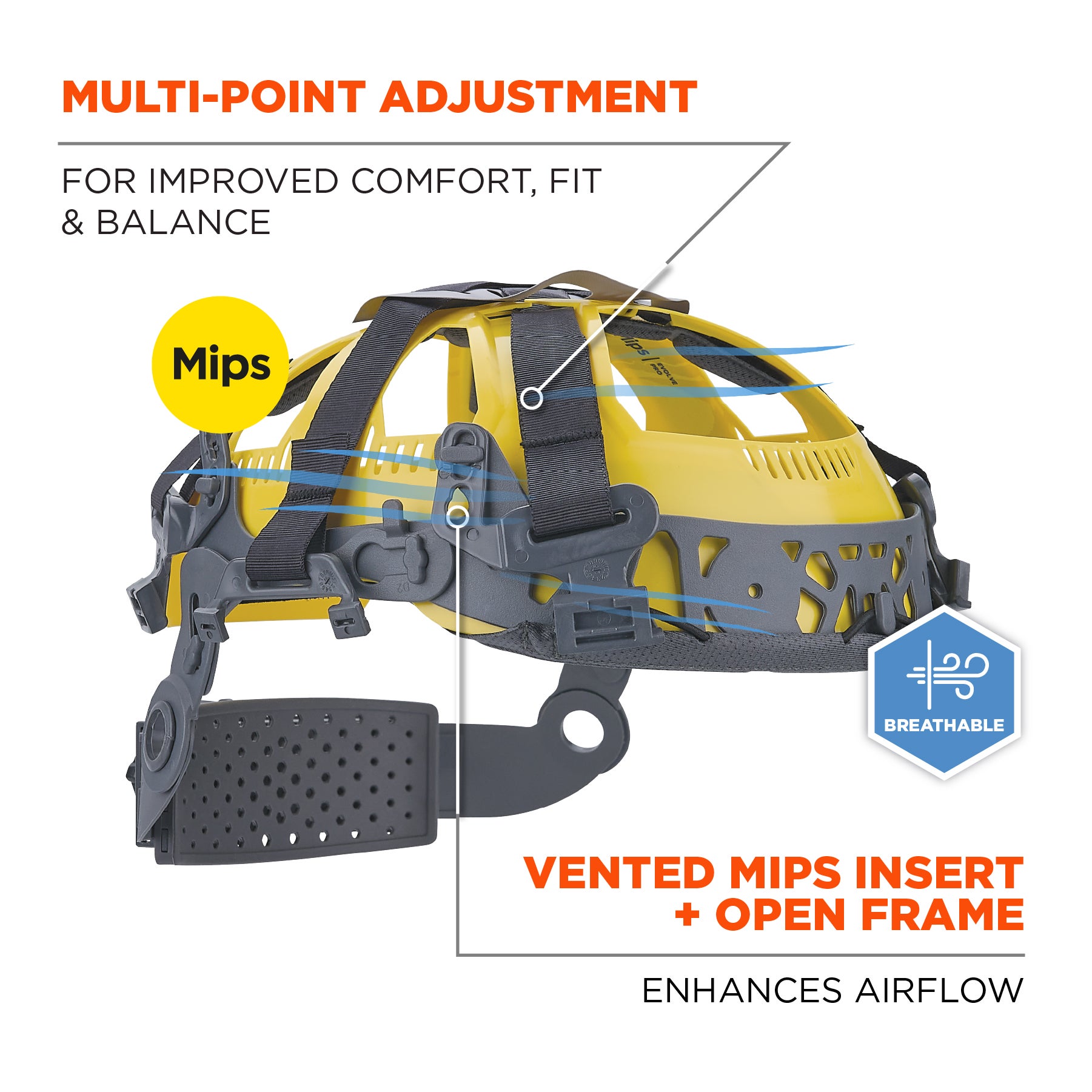 Unlike traditional hard hats and safety helmets which are designed primarily to protect against direct impacts, this safety helmet features Mips technology for protection against angled impacts—a common form of impact that occurs upon falling or contact to the sides of the head.