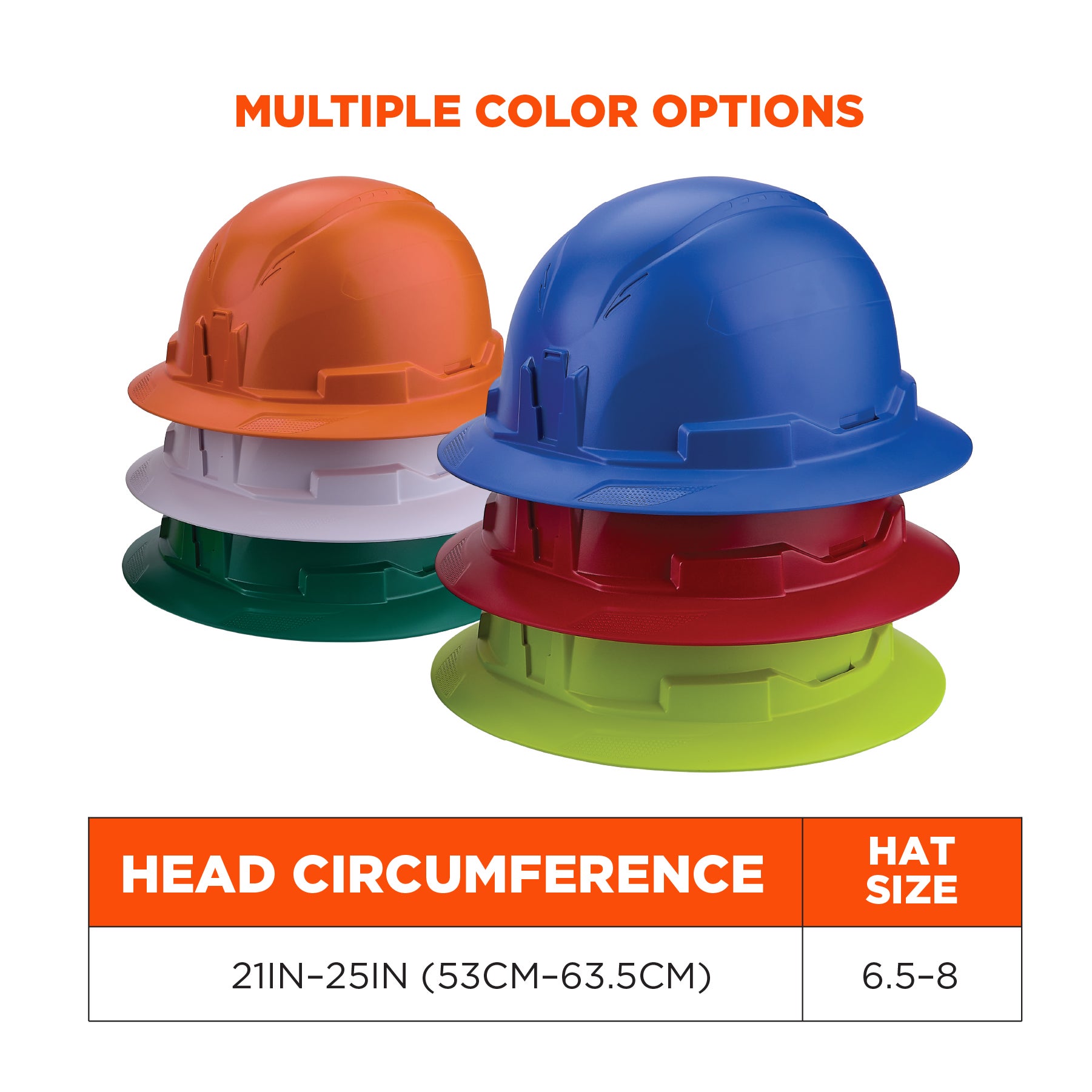This safety helmet fits hat sizes 6.5 - 8 (21in – 25 in / 53cm – 63.5cm). The size of the height-adjustable 6-point suspension is easy to dial in using the one-handed LockFit™ ratchet system. Simply pull the rear knob out and twist to tighten or loosen the fit, and push knob in to securely lock in place. Built with weight distribution in mind, this safety helmet has a snug and balanced fit. An adjustable chin strap (included) secures the helmet to the head and ensures it does not dislodge if the worker falls or is impacted by another object.