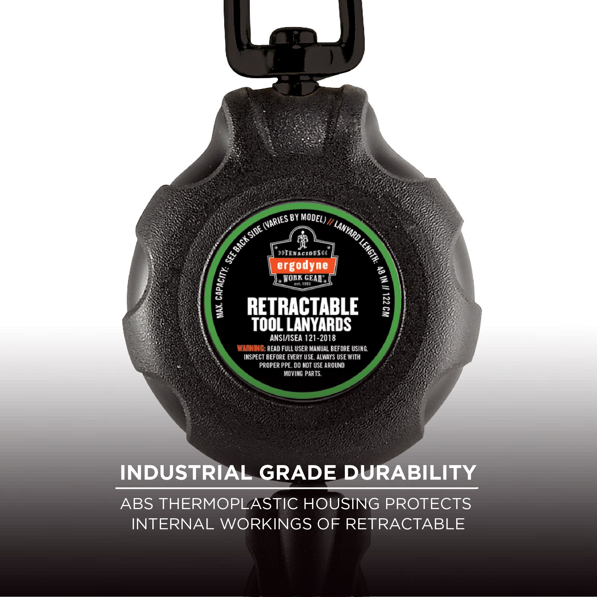 This retractable lanyard is made with a Technora cord for ultimate strength and durability. The durable ABS plastic housing is textured for better grip and is designed to protect the internal workings of the retractable. This retractable tether measures 48in / 122cm when fully extended.